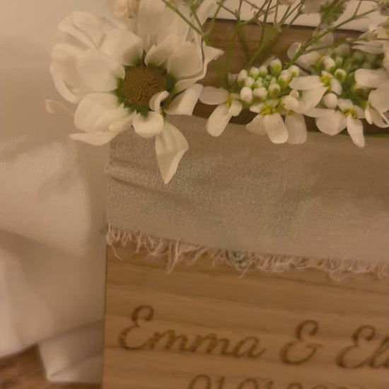 Bitte beachte: Im Lieferumfang ist lediglich eure personalisierte Holzkarte enthalten - Blumenschmuck und sonstige Deko wie auf den Bildern ist NICHT dabei.
