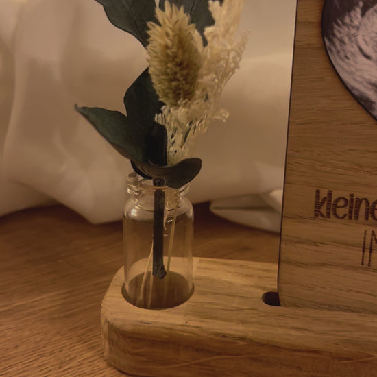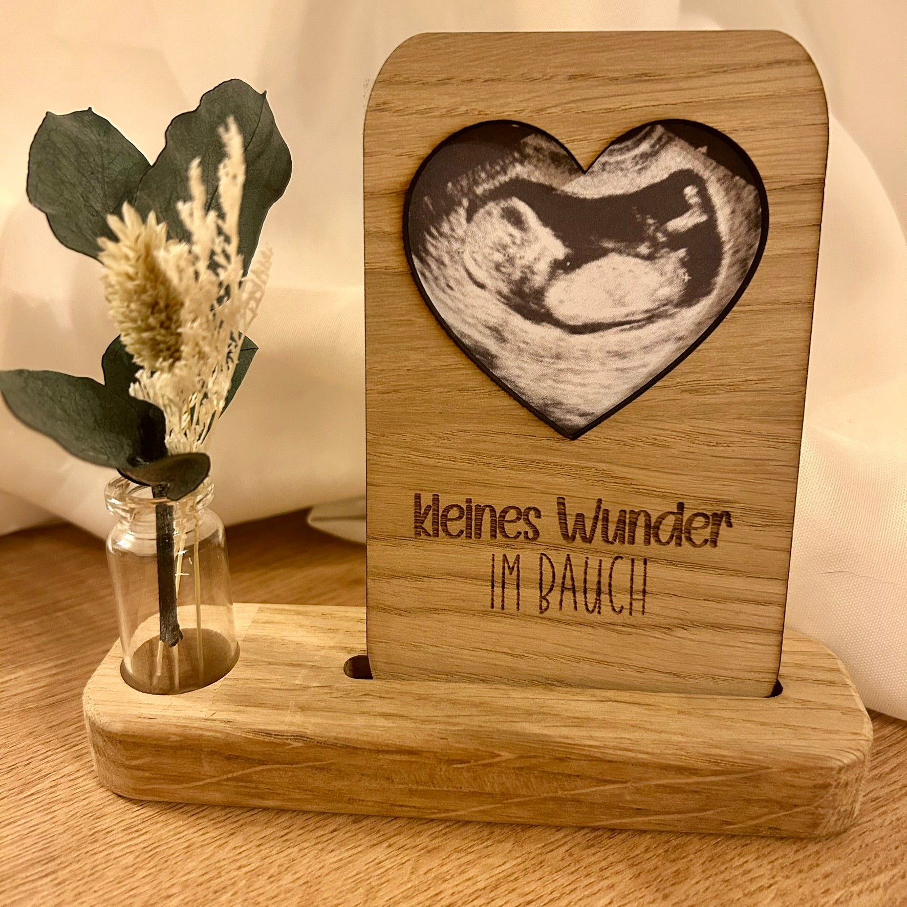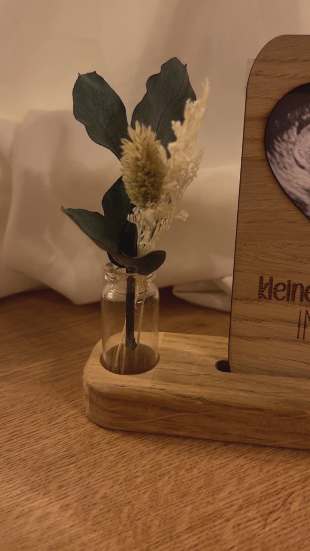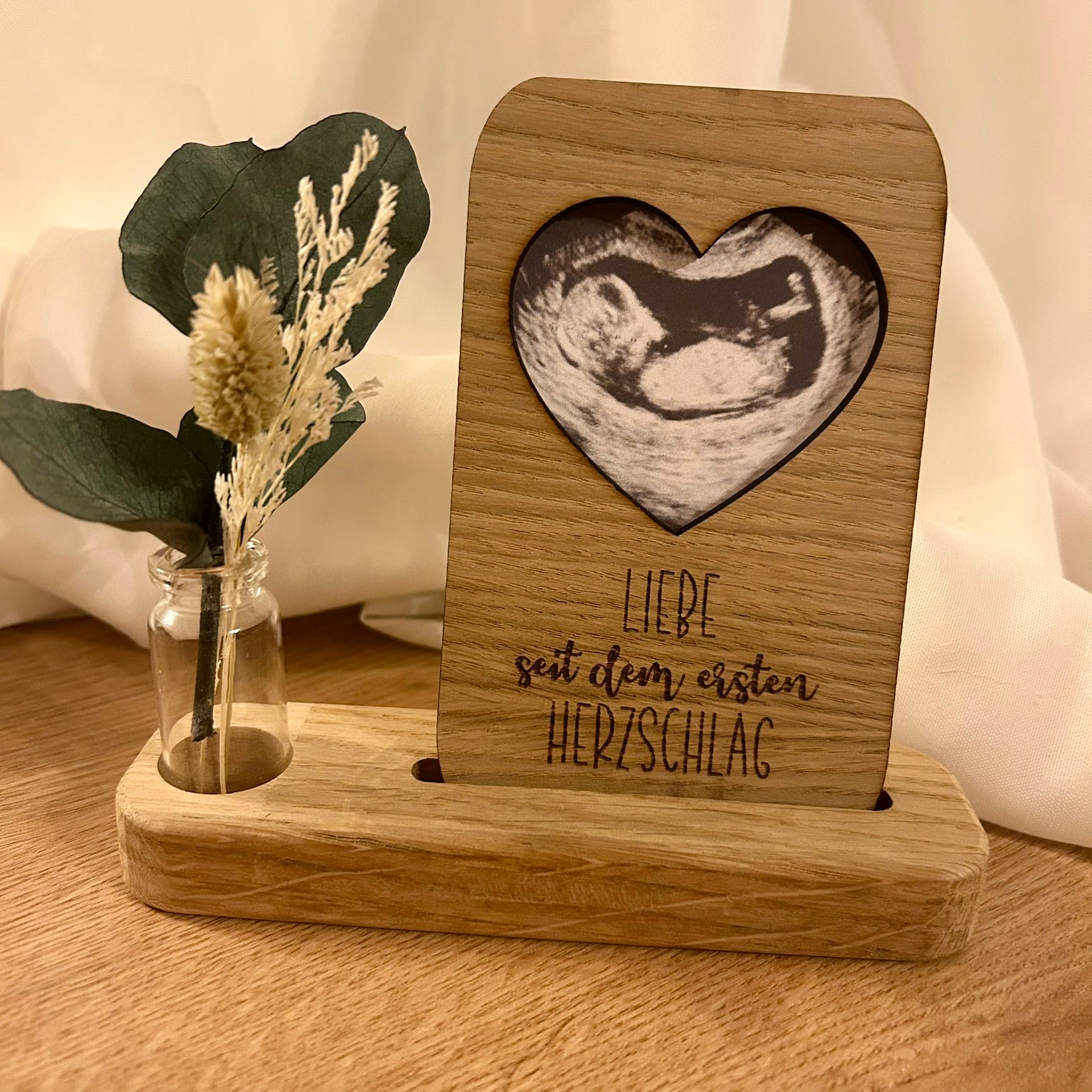 Dieser liebevoll gestaltete Bilderrahmen aus Eichensperrholz (130 x 80 mm) mit Herzausschnitt bietet Platz für ein Ultraschallbild und wird von einem passenden Spruch ergänzt. Der Eichenholzsockel (150 × 45 × 18 mm) besitzt eine Aussparung für eine kleine Vase mit Trockenblumen – ein stilvolles Deko-Element und eine besondere Erinnerung an die erste Zeit der Schwangerschaft.