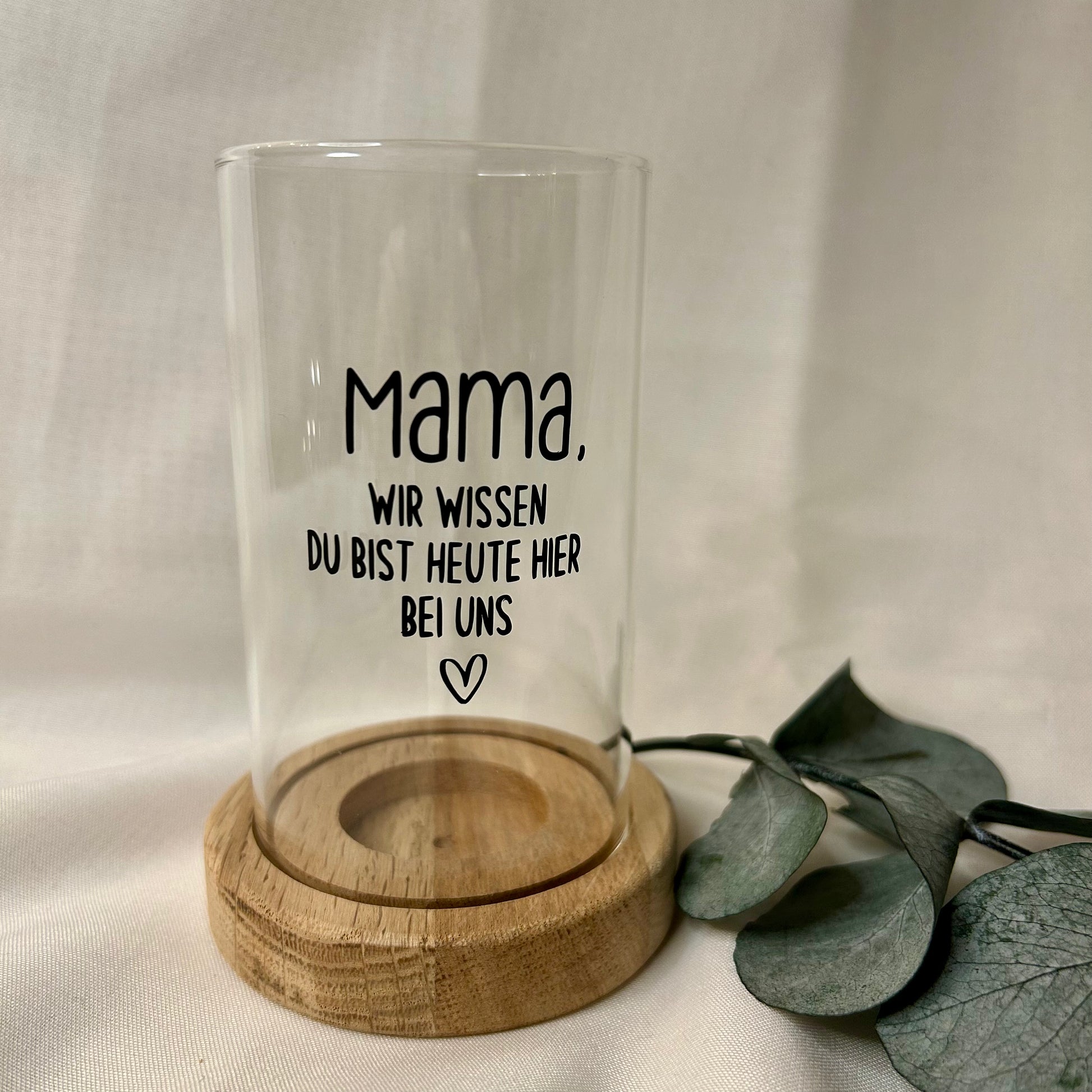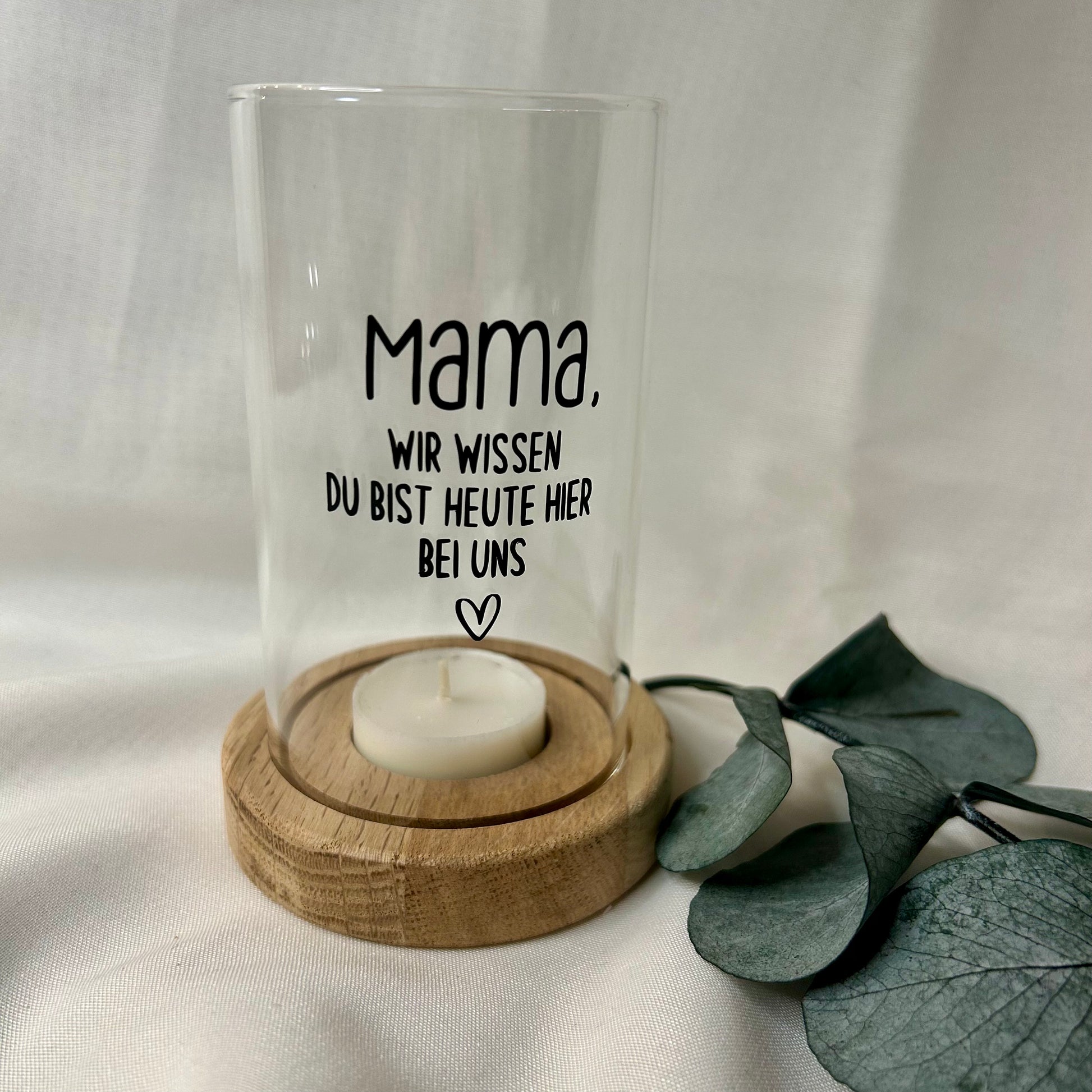 Dieses edle Gedenklicht vereint schlichte Eleganz mit einer tiefen Bedeutung. Das Windlicht ruht auf einem hochwertigen Sockel aus Eiche und trägt einen liebevollen Spruch, der Trost spendet und an besondere Momente erinnert. Mit einem Durchmesser von ca. 7 cm und einer Höhe von ca. 13 cm passt es perfekt in jedes Zuhause.