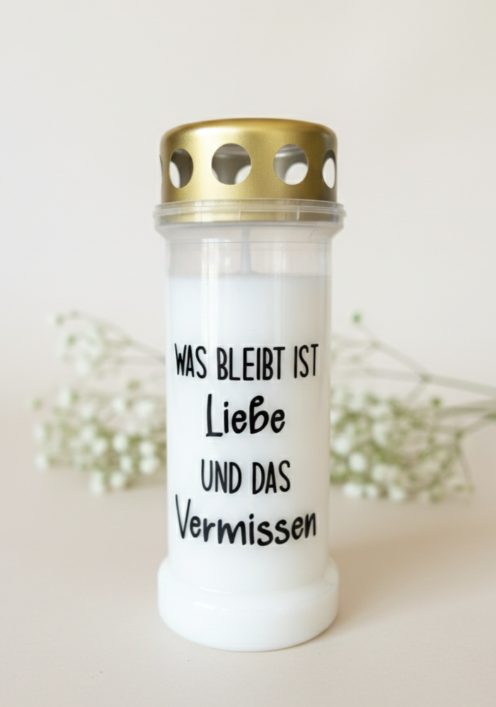 Unser größtes Herzensthema sind Gedenkkerzen und Trauerartikel. Wir fertigen sie individuell, mit viel Liebe und Respekt – weil wir selbst wissen, wie schwer es ist, einen geliebten Menschen zu verlieren. Aus eigenen Schicksalsschlägen ist der Wunsch entstanden, etwas zu schaffen, das mehr ist als ein Massenprodukt. Etwas Persönliches. Etwas, das Worte trägt, wenn sie fehlen. Denn oft gibt es noch so viel zu sagen – und genau das möchten wir mit unseren individuellen Grab- und Gedenkkerzen möglich machen. Gleichzeitig gibt es im Leben auch viele schöne, besondere Anlässe. Geburt, Hochzeit, Einzug, Geburtstag – oder einfach ein kleines „Danke“. Auch hier begleiten wir dich gerne mit liebevoll gestalteten, personalisierten Geschenkideen, die von Herzen kommen und lange in Erinnerung bleiben.