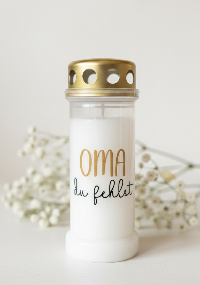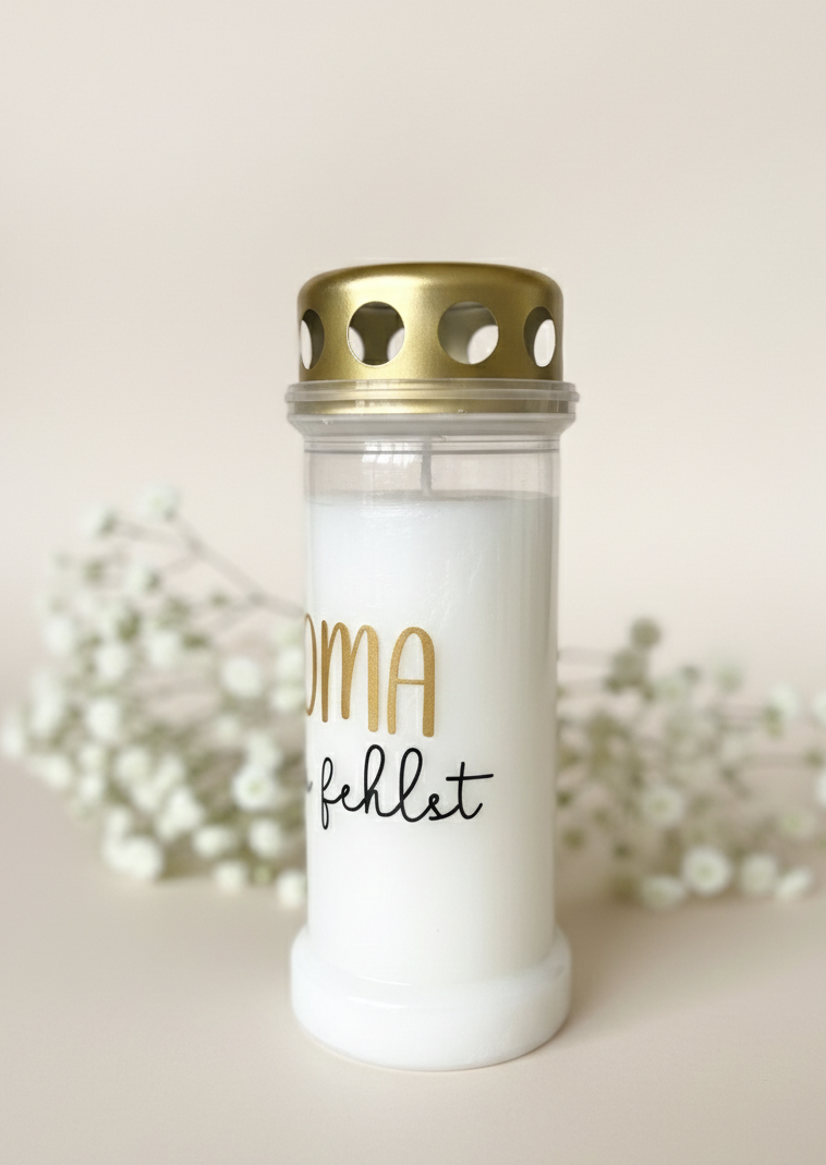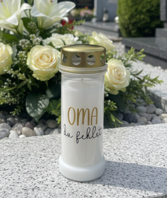 Unser größtes Herzensthema sind Gedenkkerzen und Trauerartikel. Wir fertigen sie individuell, mit viel Liebe und Respekt – weil wir selbst wissen, wie schwer es ist, einen geliebten Menschen zu verlieren. Aus eigenen Schicksalsschlägen ist der Wunsch entstanden, etwas zu schaffen, das mehr ist als ein Massenprodukt. Etwas Persönliches. Etwas, das Worte trägt, wenn sie fehlen. Denn oft gibt es noch so viel zu sagen – und genau das möchten wir mit unseren individuellen Grab- und Gedenkkerzen möglich machen. Gleichzeitig gibt es im Leben auch viele schöne, besondere Anlässe. Geburt, Hochzeit, Einzug, Geburtstag – oder einfach ein kleines „Danke“. Auch hier begleiten wir dich gerne mit liebevoll gestalteten, personalisierten Geschenkideen, die von Herzen kommen und lange in Erinnerung bleiben.
