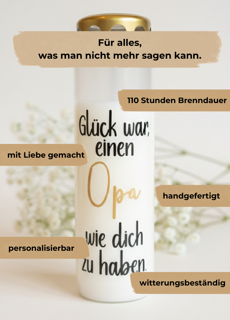 Unser größtes Herzensthema sind Gedenkkerzen und Trauerartikel. Wir fertigen sie individuell, mit viel Liebe und Respekt – weil wir selbst wissen, wie schwer es ist, einen geliebten Menschen zu verlieren. Aus eigenen Schicksalsschlägen ist der Wunsch entstanden, etwas zu schaffen, das mehr ist als ein Massenprodukt. Etwas Persönliches. Etwas, das Worte trägt, wenn sie fehlen. Denn oft gibt es noch so viel zu sagen – und genau das möchten wir mit unseren individuellen Grab- und Gedenkkerzen möglich machen. Gleichzeitig gibt es im Leben auch viele schöne, besondere Anlässe. Geburt, Hochzeit, Einzug, Geburtstag – oder einfach ein kleines „Danke“. Auch hier begleiten wir dich gerne mit liebevoll gestalteten, personalisierten Geschenkideen, die von Herzen kommen und lange in Erinnerung bleiben.